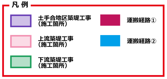 この度、名取川日辺地区堤防機能を強化する工事を実施するに伴い、下記運搬経路にて工事車両(ダンプトラック等)が運行しますのでお知らせ致します。