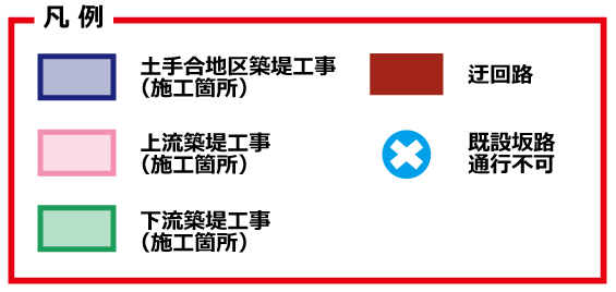 また工事に伴い、堤防天端(市道)から施工箇所における既設坂路の通行ができなくなるため、河川敷への迂回路についても下記でご案内しておりますので、お知らせ致します。
